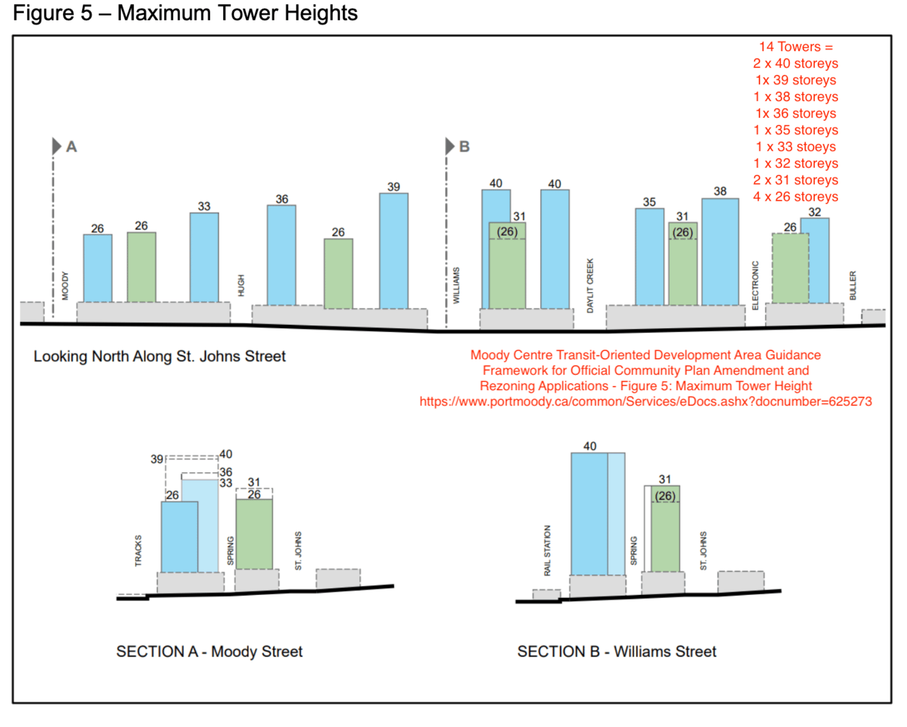 The report refers to the Moody Centre TOD Framework and states “a vision for 14 towers up to 40 storeys”. It’s been said that saying we don’t have any applications for 40 storeys when we have an application for two 39-storey towers is splitting hairs. If that’s splitting hairs, then the statement above is a gross exaggeration verging on irresponsible and clearly designed to provoke an emotional response. Figure 5 from the Moody Centre Transit-Oriented Development Area Guidance Framework shows otherwise. You can find the entire document here - please read it! It contemplates park space, child care spaces, employment and many other facets of development. It is meant to guide landowners in their applications.